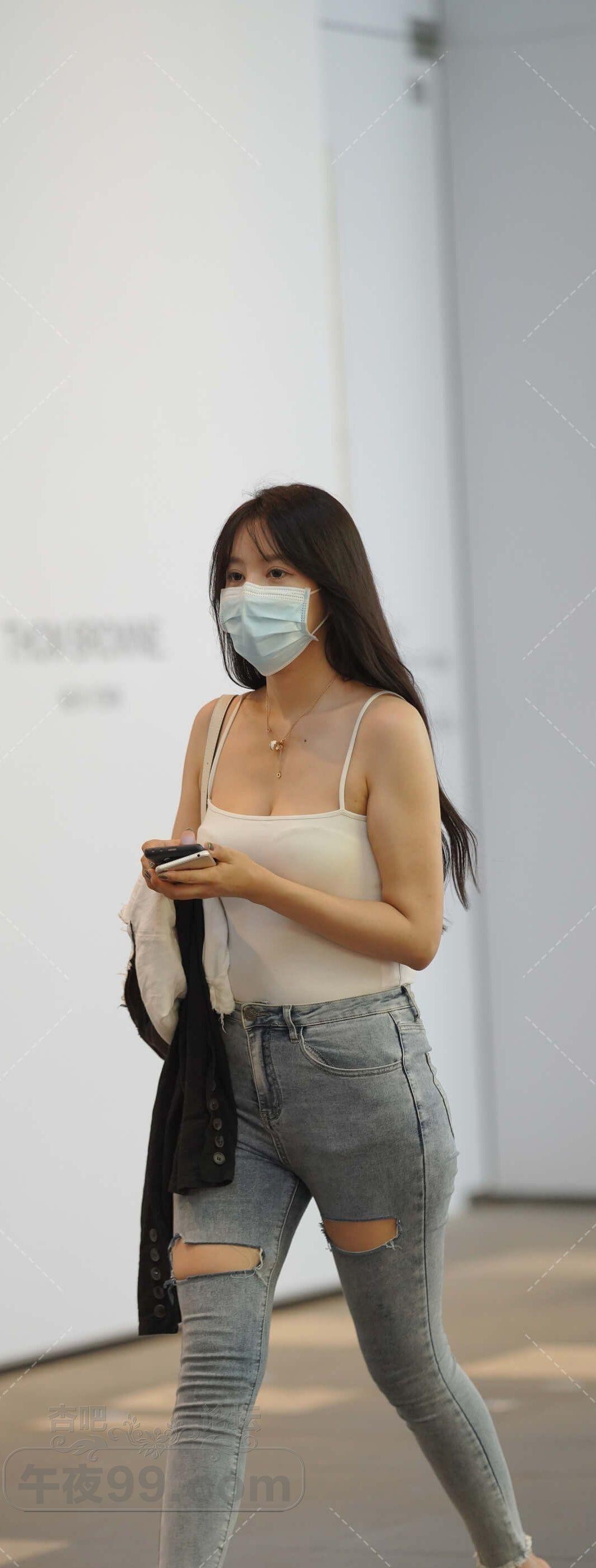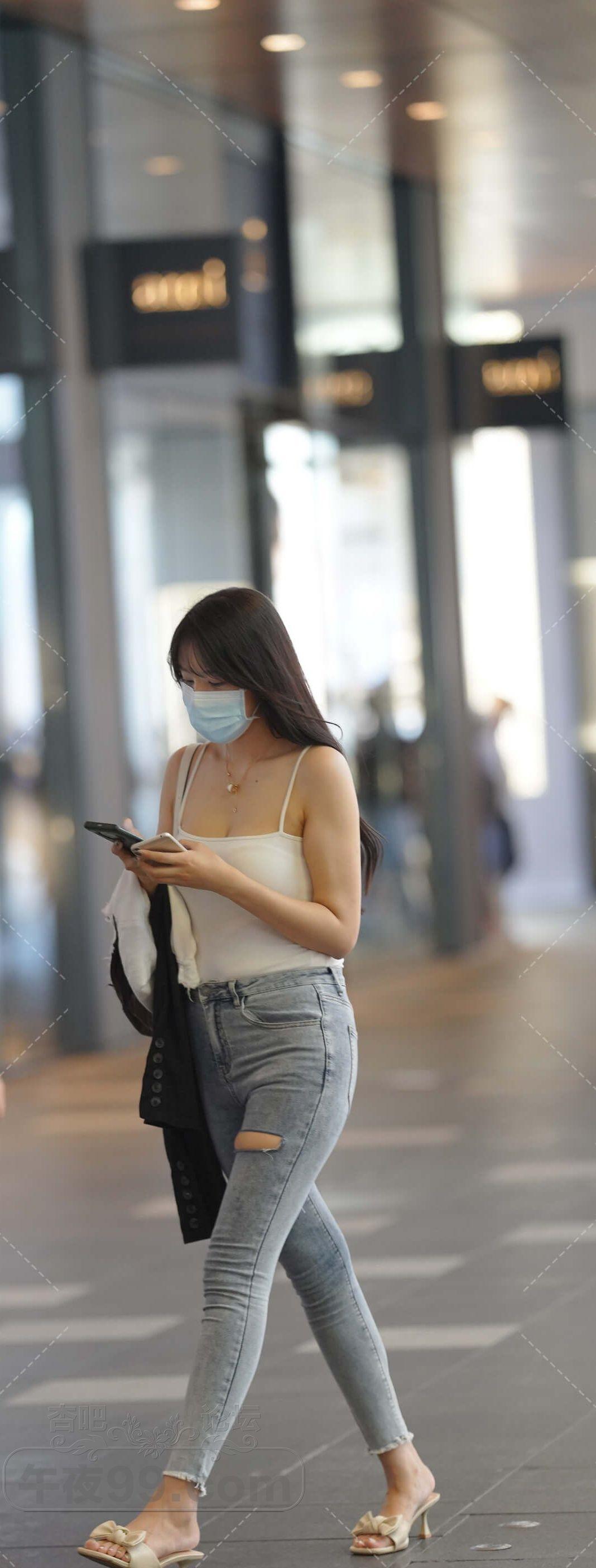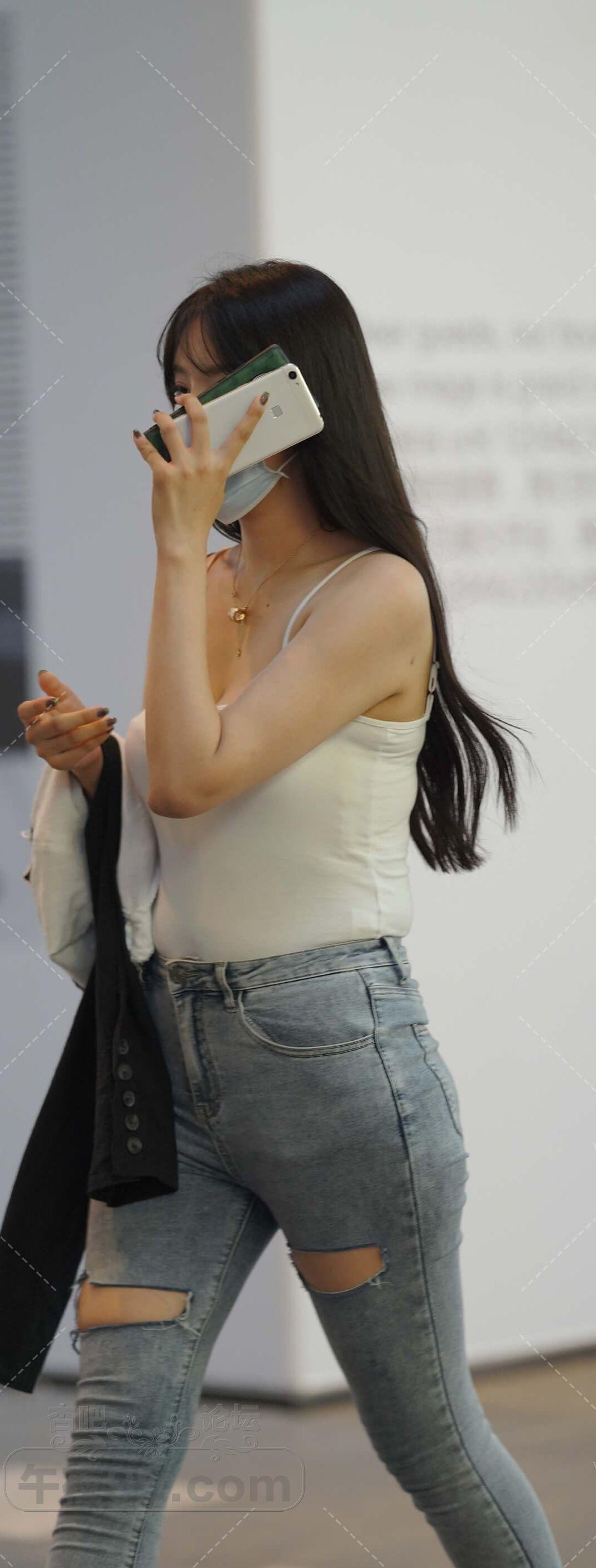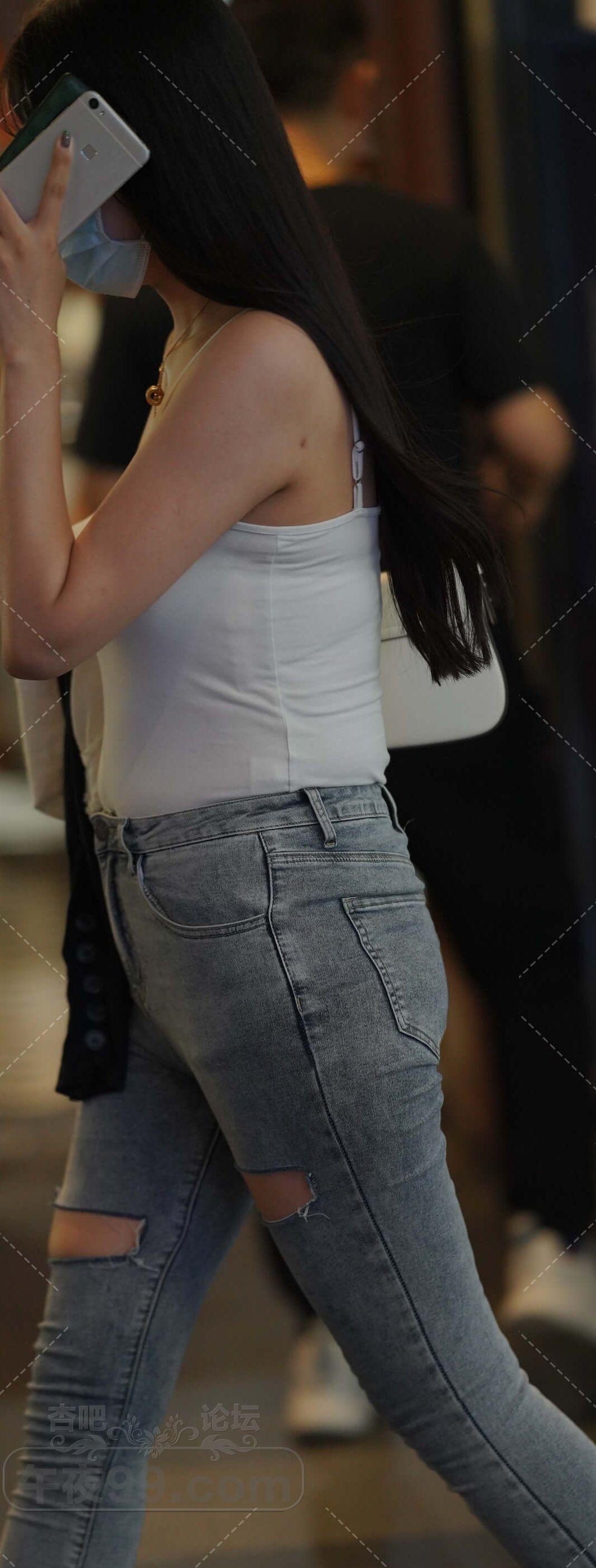 白色背心破洞牛仔紧身裤美女横穿马路【16P】
