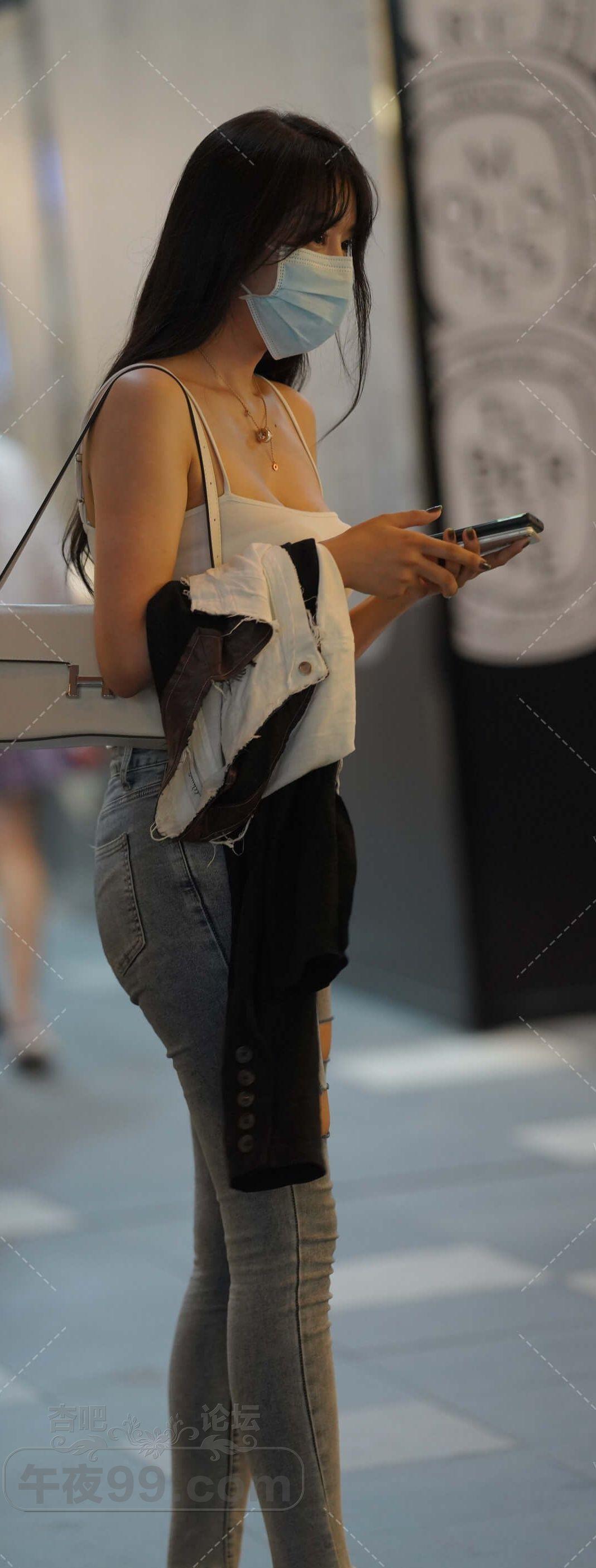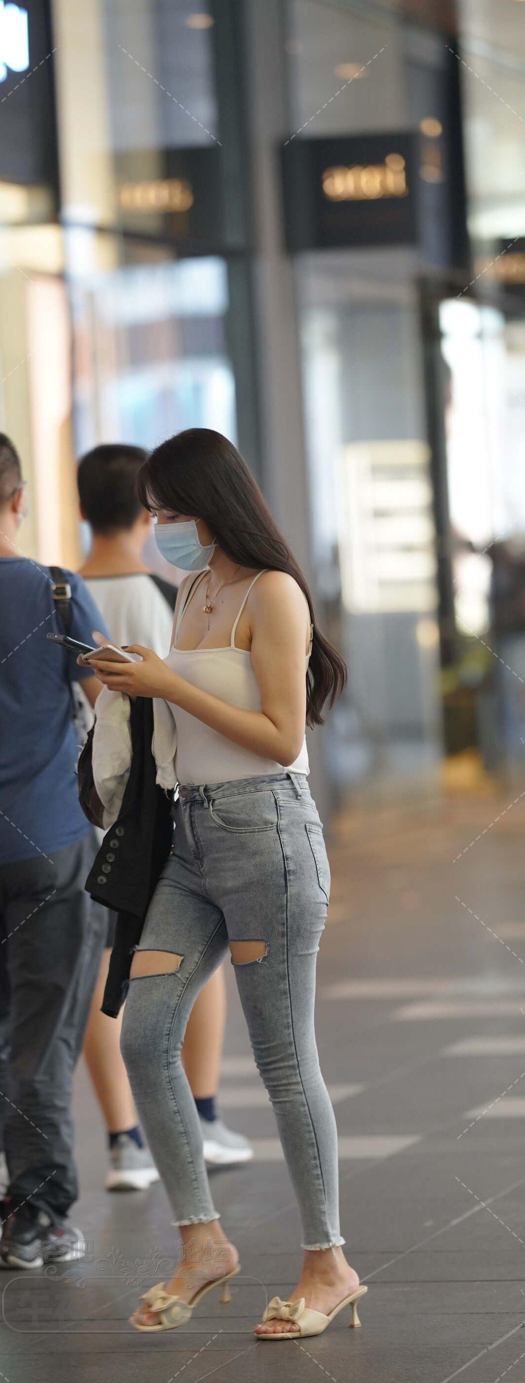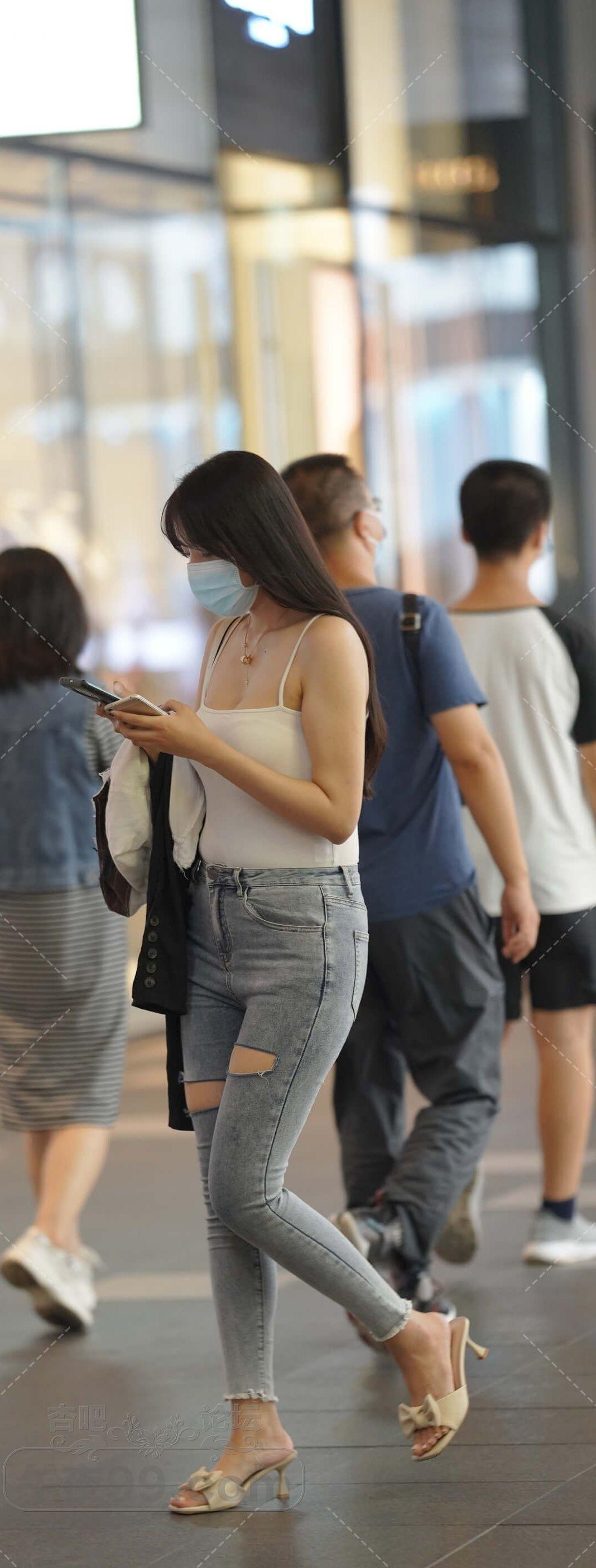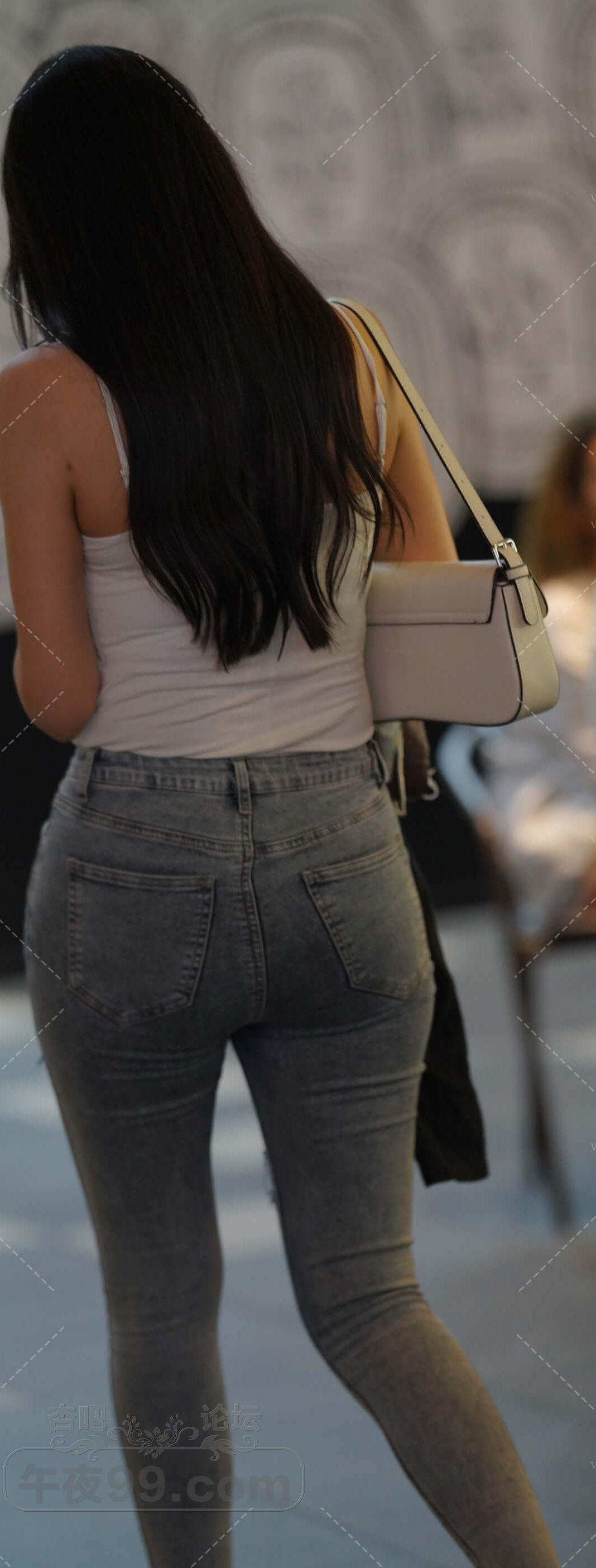 白色背心破洞牛仔紧身裤美女横穿马路【16P】